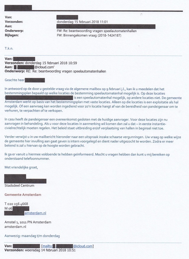 Ondernemer of OM?In de reactie namens het stadsdeel vallen een paar dingen op. De ambtenaar van stadsdeel Centrum schrijft aan de vragensteller: ‘Als u voor deze locaties in aanmerking wil komen dan zal u dat – in eerste instantie – civielrechtelijk moeten regelen.’ Blijkbaar is de vragensteller geen medewerker van het OM dat begin 2018 begint met het bewerken en manipuleren van de Kansspelautoriteit en het Landelijk Bureau Bibob om de landelijke vergunningen van La Lau in te trekken. De vragensteller lijkt dus een belanghebbende speelhalexploitant, of iemand die zich als zodanig heeft voorgedaan. Dit sluit een actie van het OM niet uit. De periode waarin de mail is gestuurd is daarvoor té toevallig. Bovendien: een slimme exploitant die reeds speelhallen in Amsterdam bezit en exploiteert, gaat de gemeente niet wijzen op jurisprudentie waarmee hij het voortbestaan van zijn eigen bedrijven en van alle Amsterdamse speelhallen in gevaar brengt. Want dát is uiteindelijk het gevolg van de via icloud.com verzonden mail van 14 februari 2018 aan stadsdeel Centrum.