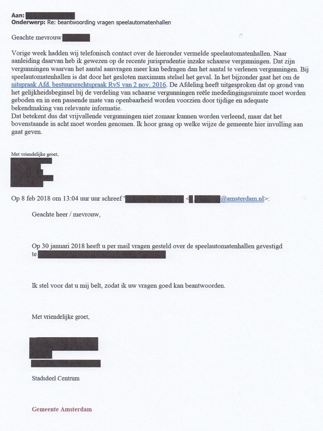 De vragen van de onbekende persoon over mijn speelhallen die op 30 januari 2018 per mail aan de ambtenaar zijn gesteld, zijn geen onderdeel van het Wob-document. Dit relevante en interessante deel van de correspondentie is weggelaten. Waarom zijn die vragen geheim gehouden? En waarom stelt de ambtenaar de vragensteller voor om haar te bellen in plaats van de gestelde vragen gewoon per e-mail te beantwoorden? Transparantie is ver te zoeken bij de gemeente Amsterdam.