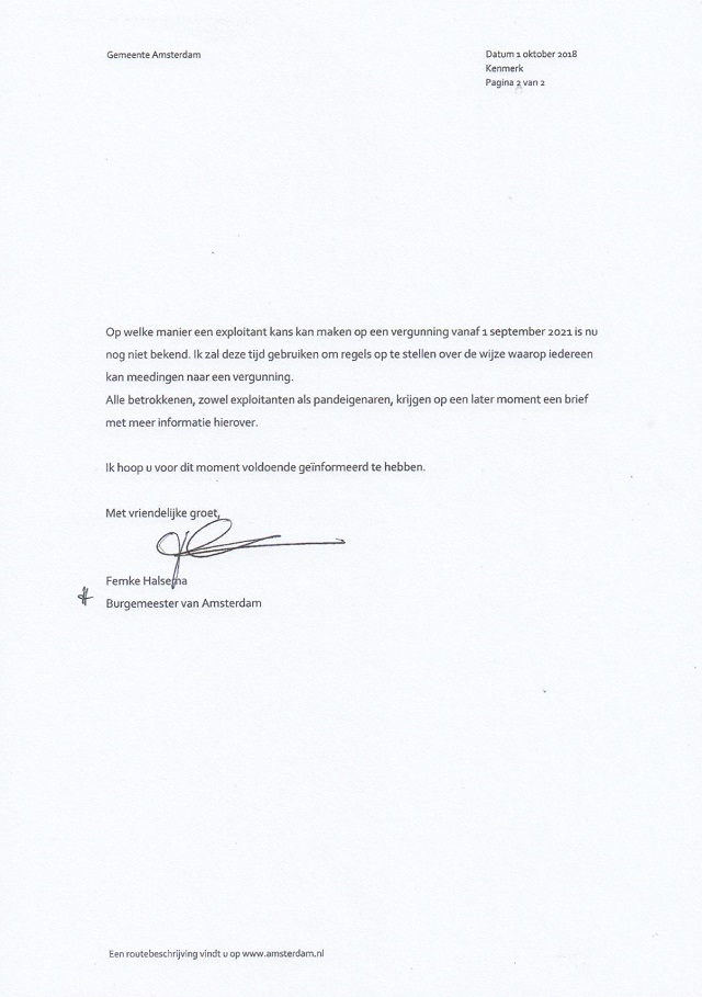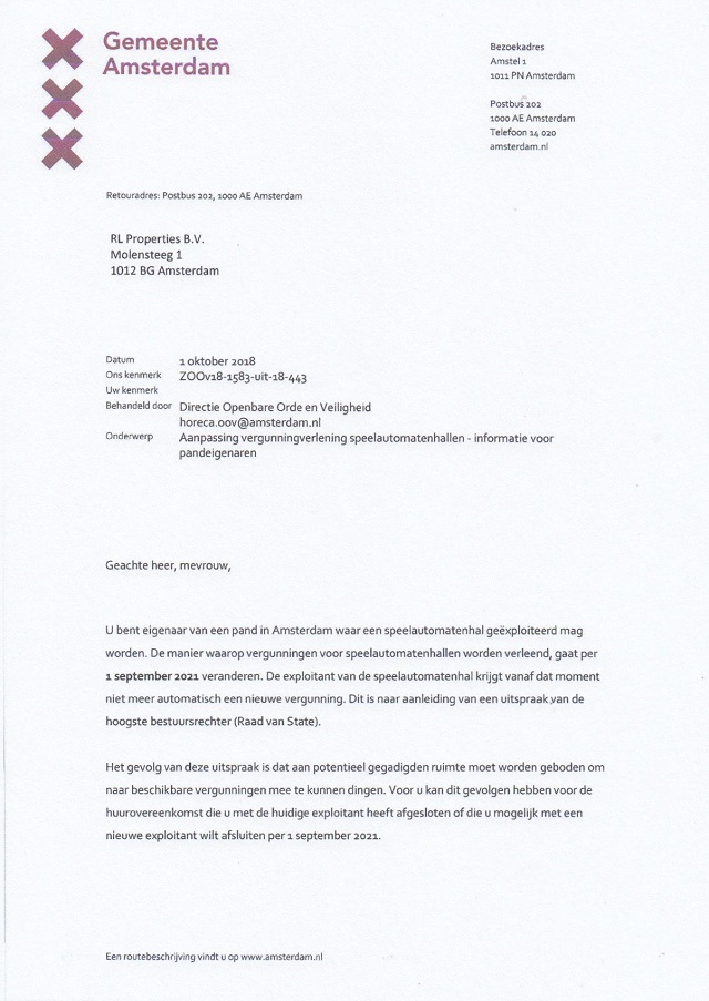 Brief van de burgemeesterOp 1 oktober 2018, bijna acht maanden ná de ‘tip’ aan de gemeente om de uitspraak van de Raad van State uit 2016 eens goed te bestuderen, is het ‘intern’ allemaal uitgezocht op het stadhuis. Op die datum stuurt burgemeester Halsema alle eigenaren van panden in Amsterdam waarin een speelhal is gevestigd een brief waarin een ingrijpende aanpassing van de vergunningverlening voor speelautomatenhallen wordt aangekondigd.